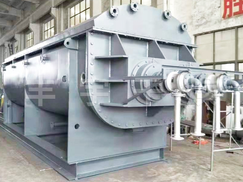 空心軸上密集排列著楔型中空漿葉,熱介質經空心軸流經漿葉。單位有效容積內傳熱面積很大,熱介質溫度從-40℃到320℃,可以是水蒸汽,也可以是液體型:如熱水、導熱油等。間接傳導加熱,沒有攜帶空氣帶走熱量,熱量均用來加熱物料。熱量損失僅為通過器體保溫層向環境的散熱。楔型漿葉傳熱面具有自清潔功能。物料顆粒與楔型面的相對運動產生洗刷作用,能夠洗刷掉楔型面上附著物料,使運轉中一直保持著清潔的傳熱面。漿葉干燥機的殼體為Ω型,殼體內一般安排二到四根空心攪拌軸。殼體有密封端蓋與上蓋,防止物料粉塵外泄而充分發揮作用。
