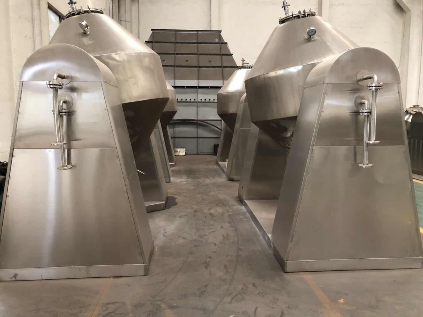 雙錐回轉真空干燥機為雙錐形回轉罐體,設備中間為圓柱形,兩端為圓錐形,圓錐頂部一頭設計為敞開式投料(兼做人孔),另一端為蝶閥出料。罐體內、外共分三層,中間夾套加熱介質可以是蒸汽、循環熱水或導熱油,保溫層為中堿超細玻璃棉,耗能極少;內層投放物料。工作時罐內處在真空狀態下,向夾套內通入導熱油、熱水或蒸汽等熱媒進行加熱,熱量通過罐體內壁傳遞給濕物料。